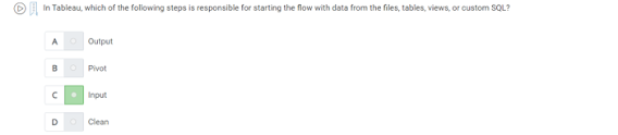 In tableau, which of the following steps is responsible for starting the flow with the data from the files, tables, views, or custom SQL?A) Input